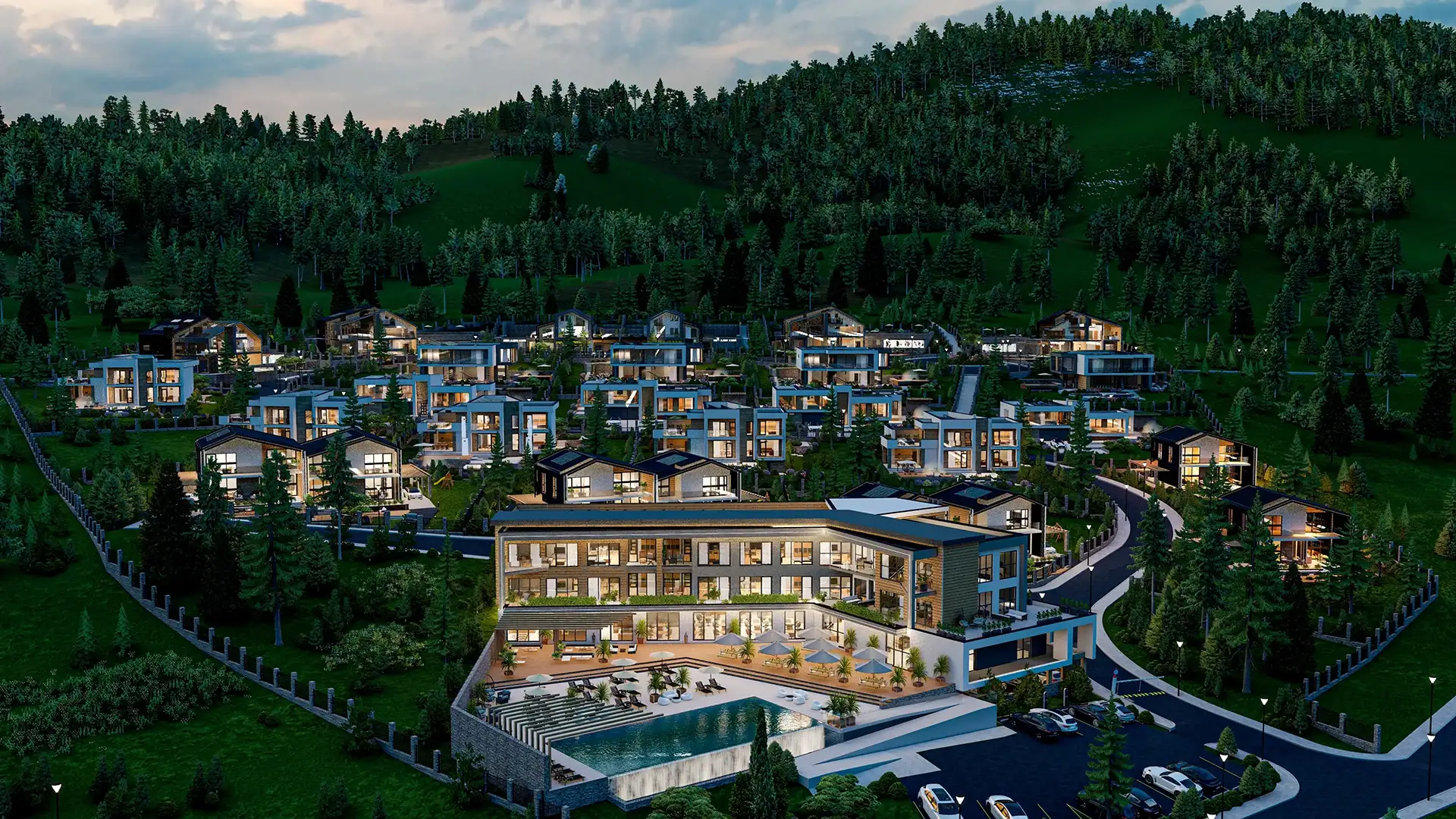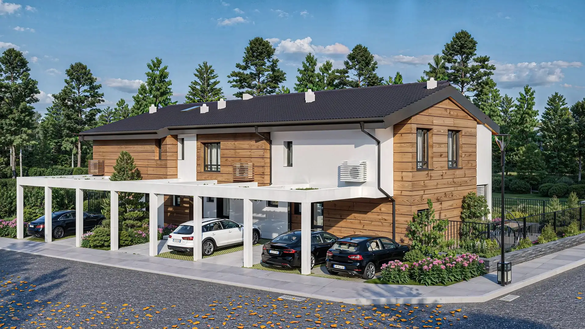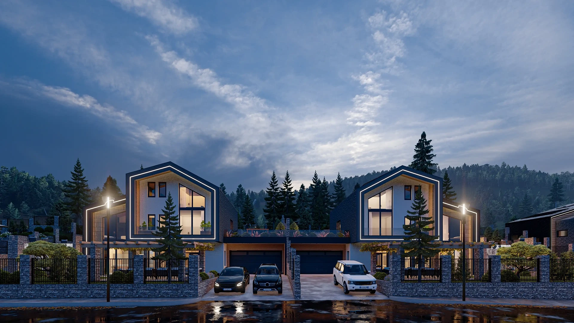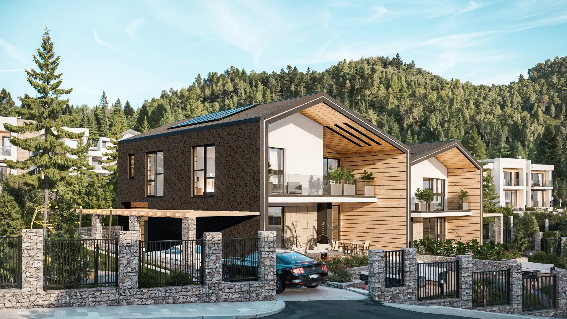Тази двуетажна къща в жилищен комплекс предлага съвременна архитектура, просторни и удобни жилищни площи и висококачествени материали. Проектът е перфектен за семейства, които търсят комфорт, стил и невероятни панорамни гледки. Визуализациите акцентират върху всички детайли и удобства, които правят тази къща идеално място за живот и почивка.