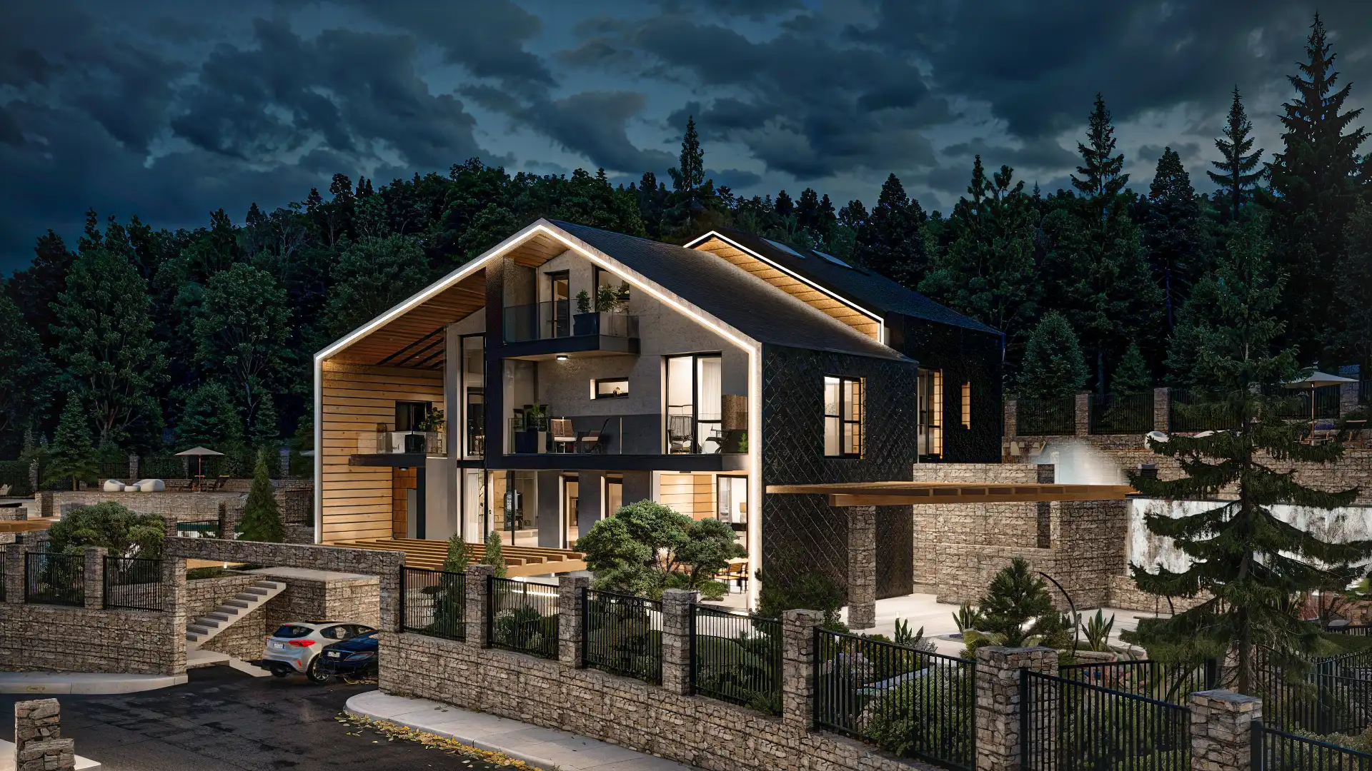Този проект е детайлно визуализиран с помощта на 3D технологии, които показват всички аспекти на дизайна. Съвременната визия на къщата, съчетана с просторни и светли вътрешни пространства, я правят идеална за модерния начин на живот. Висококачествените материали и интелигентното разпределение на помещенията създават уникално жилищно пространство с прекрасни гледки към града.