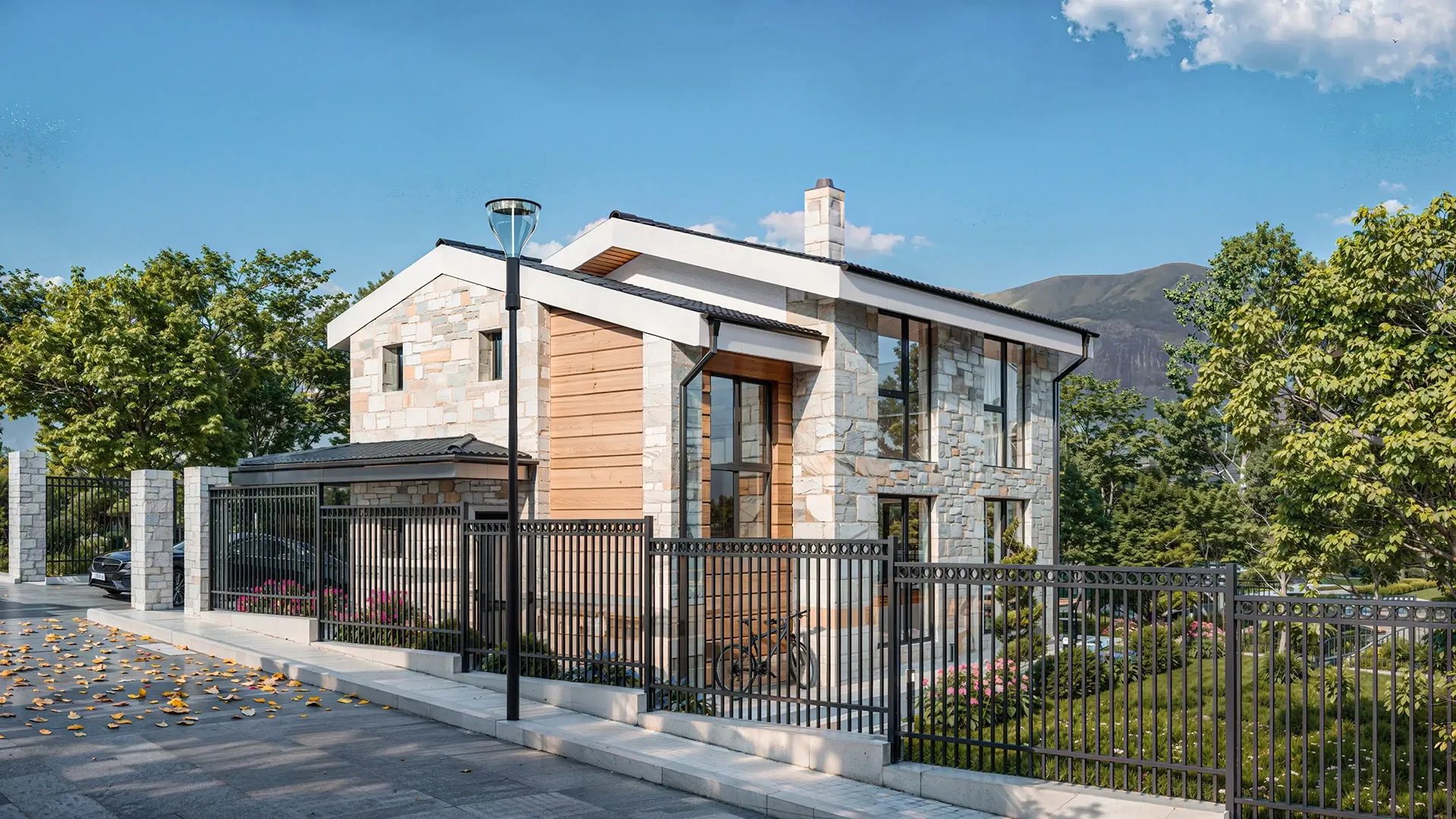 - Ограда от габиони: Ограда от габиони, която съчетава сигурност и естетика, допълваща цялостния дизайн на имота.