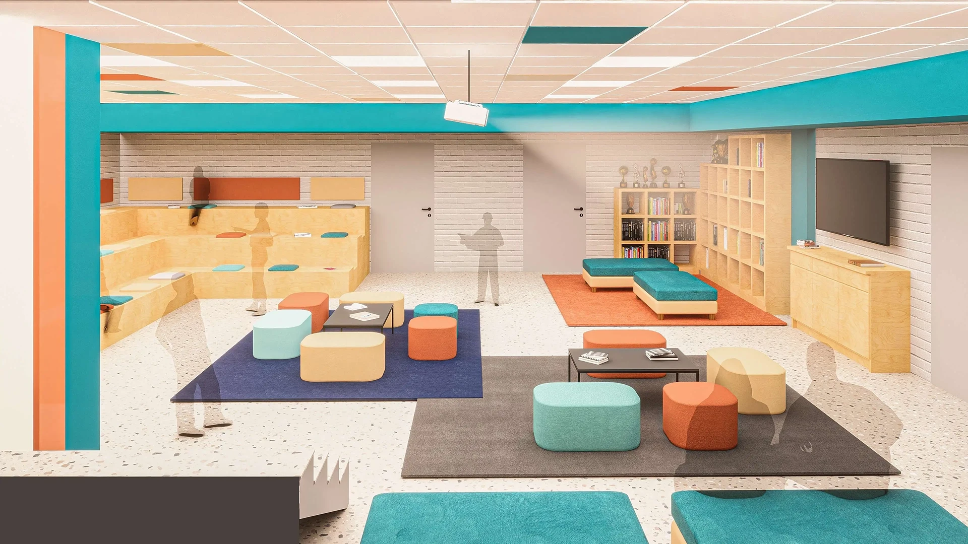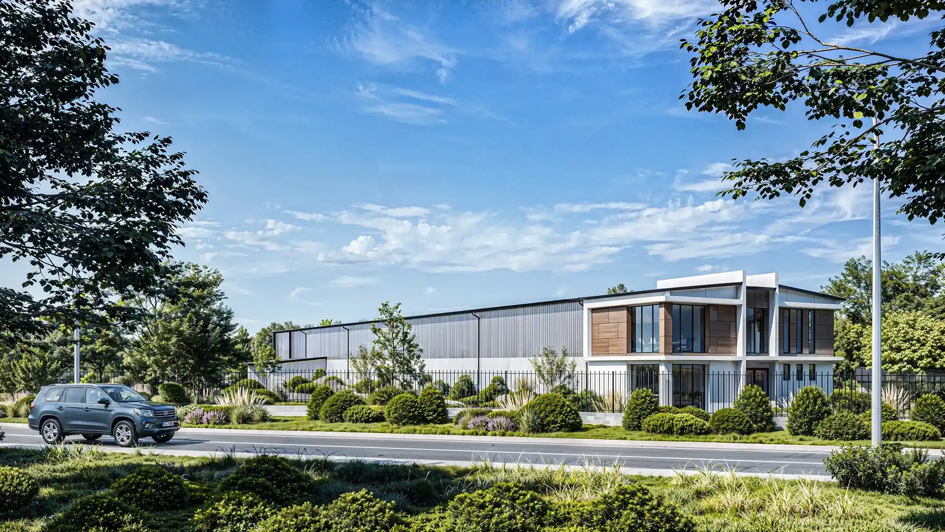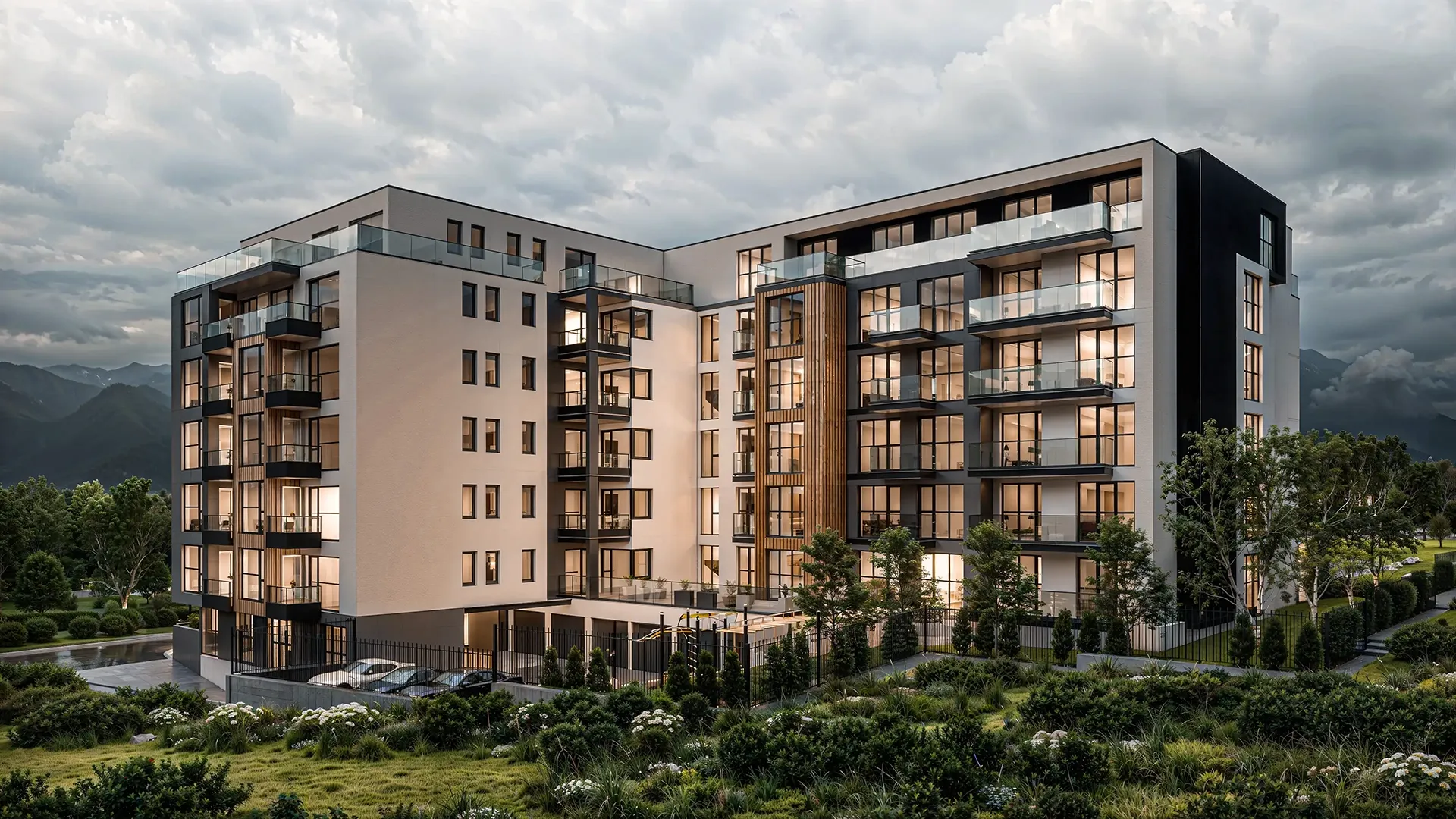 - HPL панели: Фасадата е облечена с висококачествени HPL панели, които придават съвременен и устойчив вид.