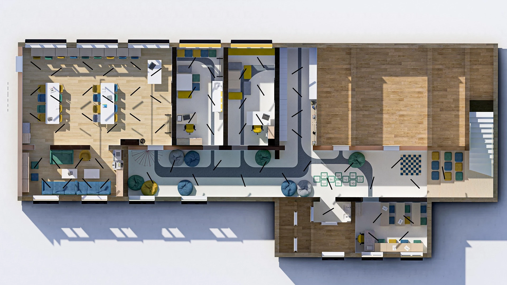 Този архитектурен проект представя съвременна двуетажна къща, разположена в престижен жилищен комплекс. Проектирана с модерен и елегантен стил, къщата предлага оптимално разпределение на пространството и изобилие от удобства, които отговарят на нуждите на съвременните семейства. Визуализацията акцентира върху висококачествените материали и големите прозорци, предоставящи панорамни гледки към града.